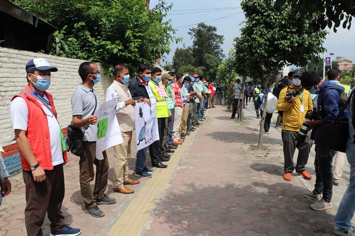 असार १९, काठमाडौं । कोरोनाभाइरस माहामारीको कारण पेशाबाट निस्काशन गरिएका तथा पारिश्रमिकबाट बञ्चित श्रमजिवी पत्रकारको हितमा नेपाल पत्रकार महासंघले आज काठमाडौंको बबरमहलमा श्रमजिवी पत्रकारको पेशागत सुरक्षाका लागि वृहत ऐक्यवद्धता प्रदर्शन आयोजना गरेको छ ।