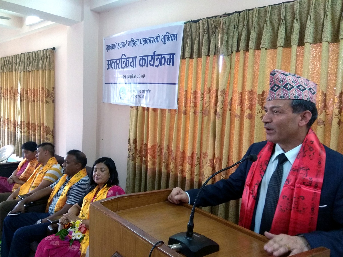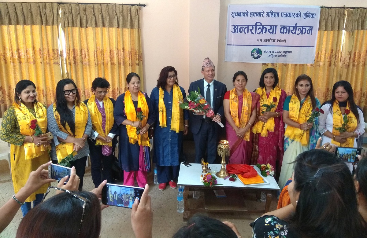 असाेज ११, काठमाडाैं । नेपाल पत्रकार महासंघ, महिला समितिले आज सूचनाको हकबारे महिला पत्रकारको भूमिका विषयमा अन्तरक्रिया कार्यक्रम आयोजना गरेको छ ।