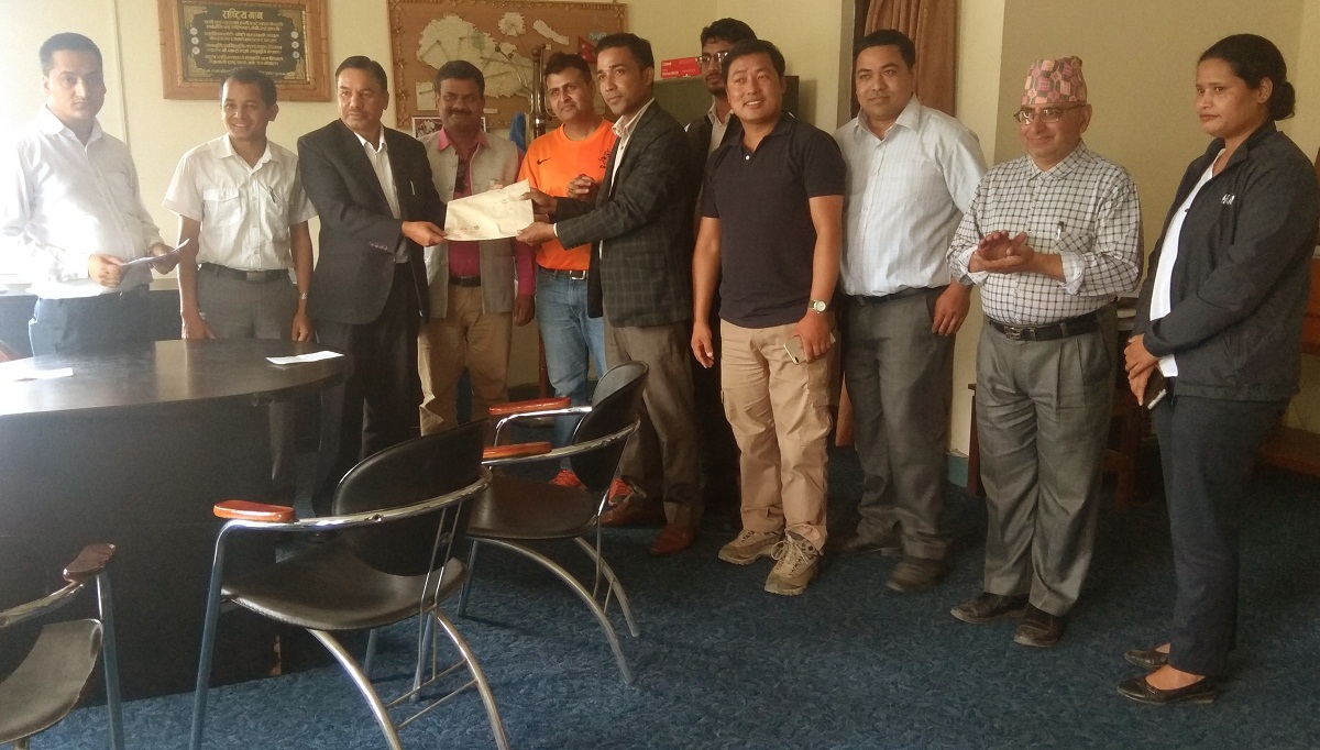 सूचना विभागमा आज आयोजित कार्यक्रममा  विभागका महानिर्देशक बालकृष्ण घिमिरे र महासंघका कोषाध्यक्ष राजेश मिश्रले एनएलजी बीमा कम्पनीका प्रतिनिधिलाई संयुक्त रुपमा चेक हस्तान्तरण गर्नुभयो ।